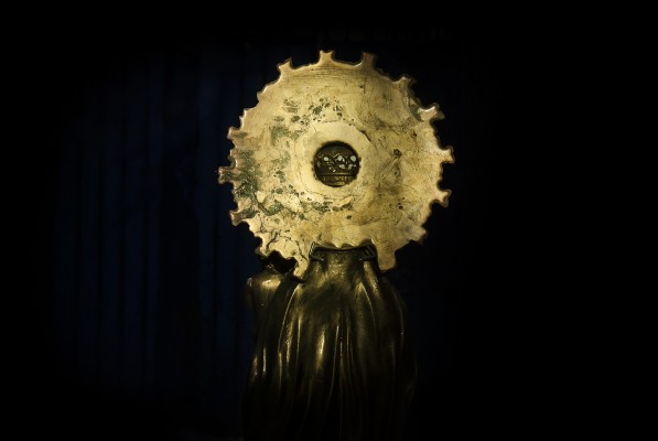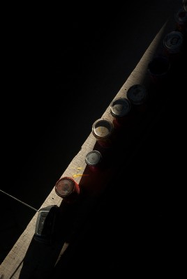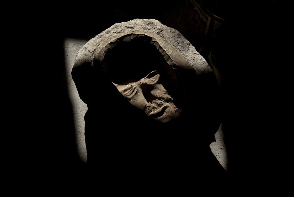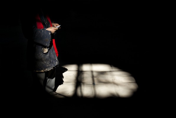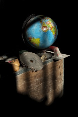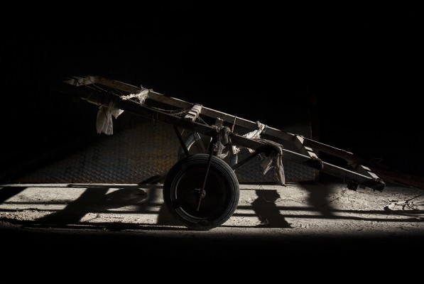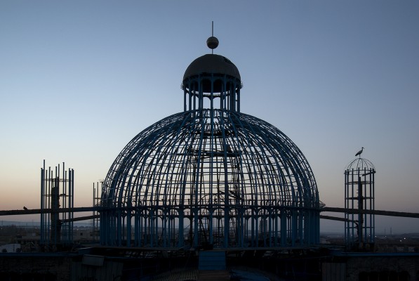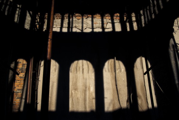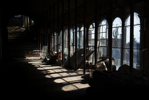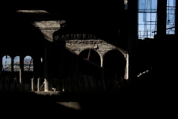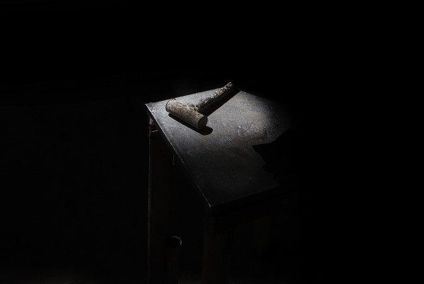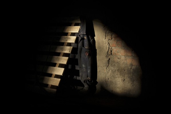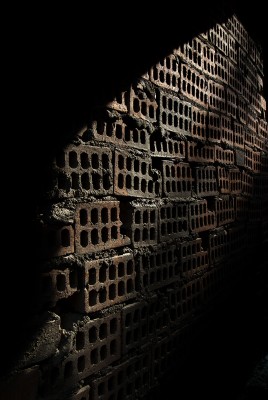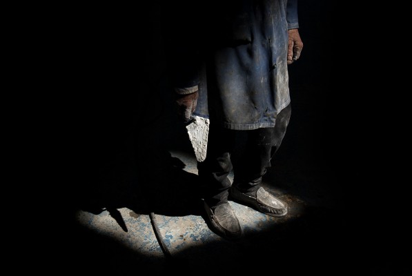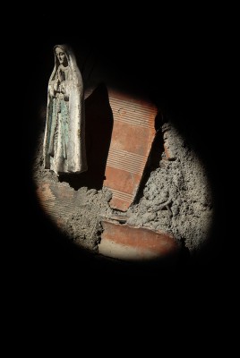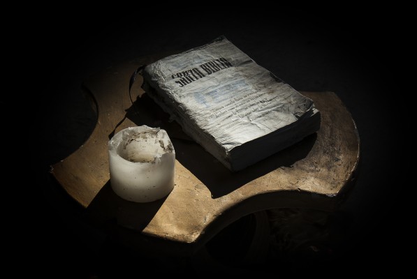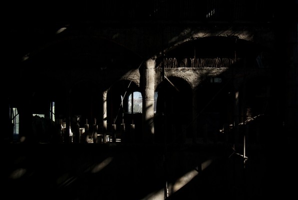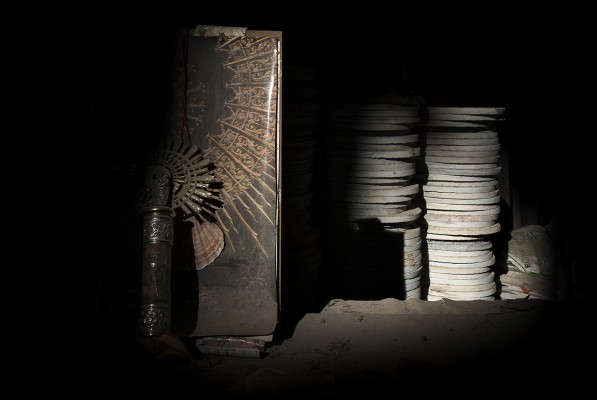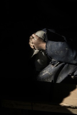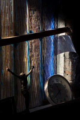 La particularité de cette série photographique, qui comporte une cinquantaine d’images, est d’avoir été réalisée au rythme et au coeur du chantier, en aidant aux travaux de construction, condition posée par le bâtisseur à ma présence prolongée sur le site. J’ai ainsi pu suivre et vivre, jour après jour, la transformation du lieu, saisir l’évolution de la construction dans ses détails, l’usage des plus simples outils au service d’un projet démesuré. Les prises de vues, souvent détails d’objets de travail et de culte religieux, et la composition des images, à partir des percées de lumière dans le bâtiment, visent à révéler le lieu par touches sans lui retirer son mystère.